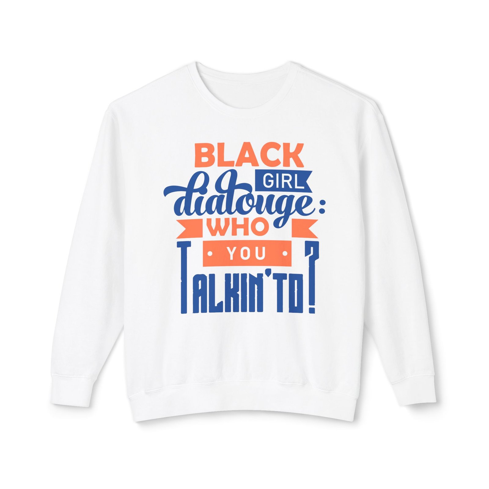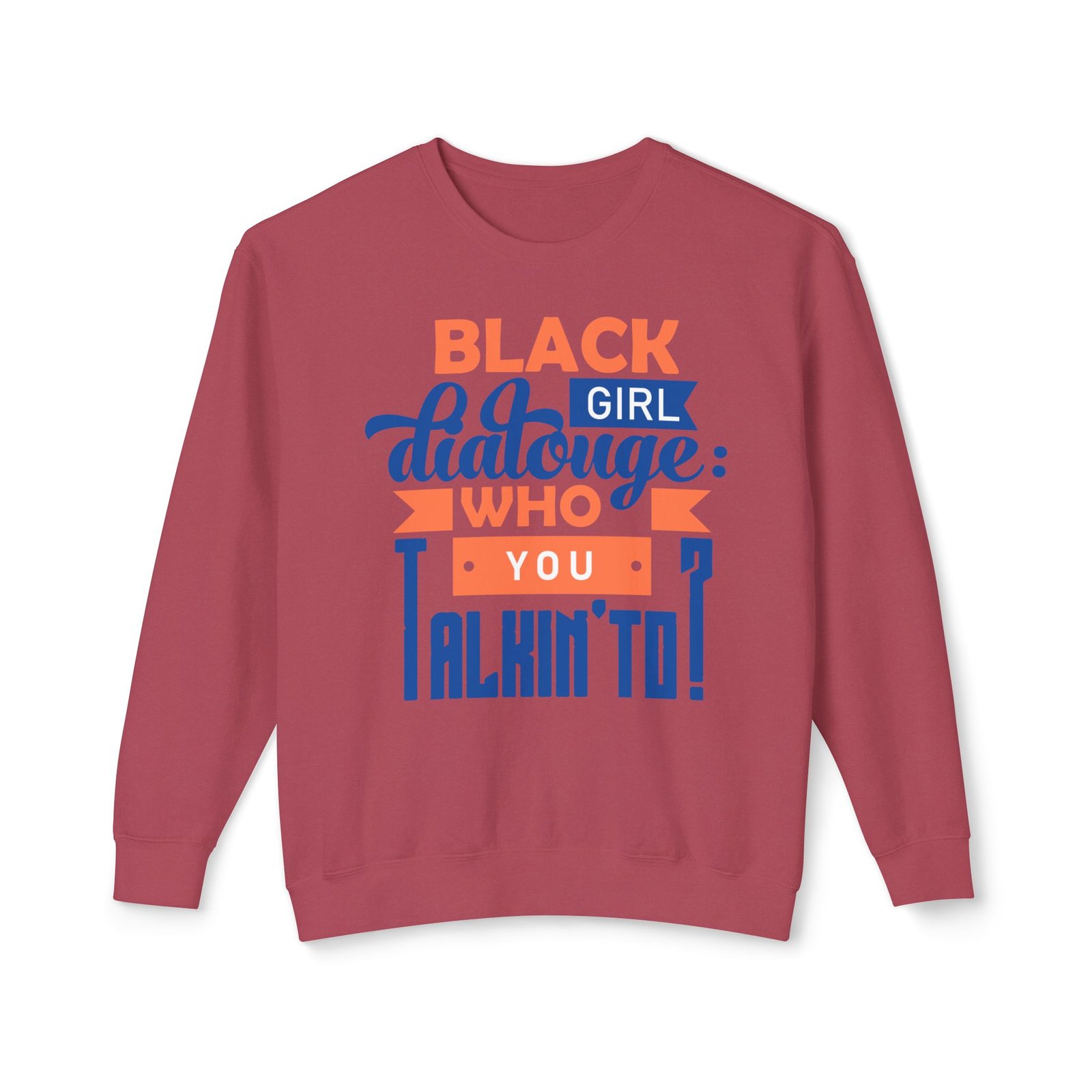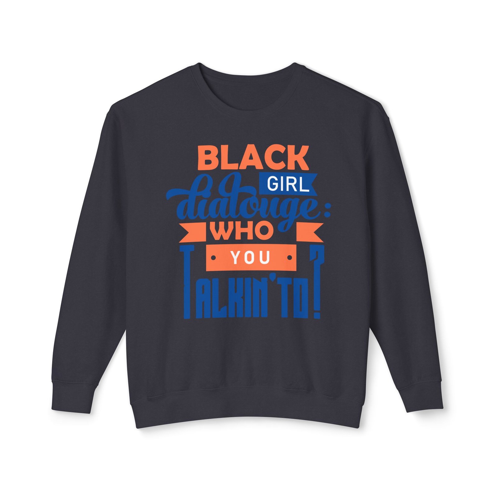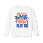 Make a bold and stylish statement with the Black Girl Dialogue Sweatshirt for Women, a cozy crewneck that celebrates authenticity, confidence, and unapologetic self-expression. Featuring the powerful phrase “Black Girl Dialogue: Who You Talkin’ To?”, this sweatshirt is perfect for women who love to stand out while staying comfortable.