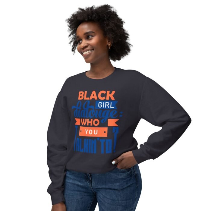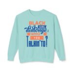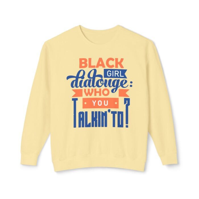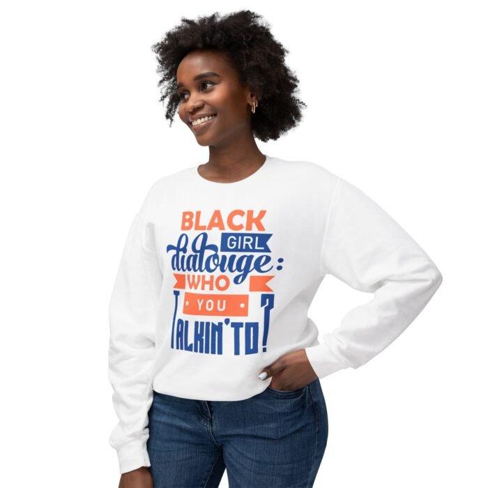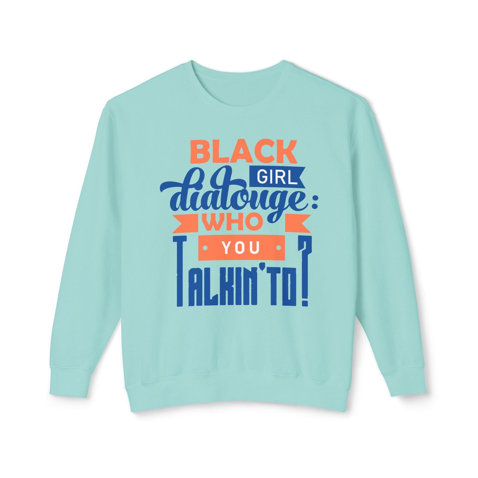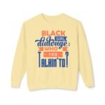 Make a bold and stylish statement with the Black Girl Dialogue Sweatshirt for Women, a cozy crewneck that celebrates authenticity, confidence, and unapologetic self-expression. Featuring the powerful phrase “Black Girl Dialogue: Who You Talkin’ To?”, this sweatshirt is perfect for women who love to stand out while staying comfortable.