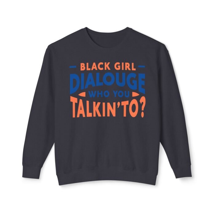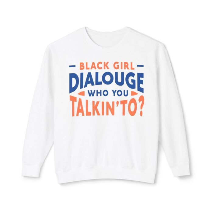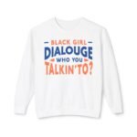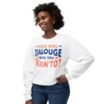 Step into comfort and confidence with the Black Girl Dialogue Women Sweatshirt, a bold crewneck designed for women who embrace authenticity and self-expression. Featuring the eye-catching statement “Black Girl Dialogue: Who You Talkin’ To?”, this sweatshirt turns any casual outfit into a conversation starter.