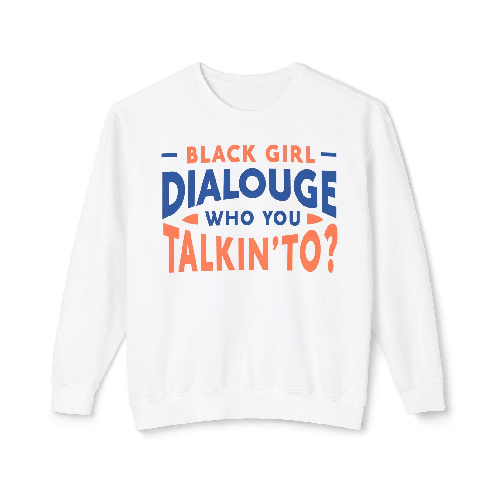 Step into comfort and confidence with the Black Girl Dialogue Women Sweatshirt, a bold crewneck designed for women who embrace authenticity and self-expression. Featuring the eye-catching statement “Black Girl Dialogue: Who You Talkin’ To?”, this sweatshirt turns any casual outfit into a conversation starter.
